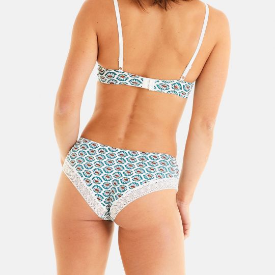 Le shorty IMPALA est en microfibre douce et imprimée, rehaussée d'un galon de dentelle géométrique et d'un piping contrasté au niveau des ouvertures des jambes. Le fond est doublé de coton. Un nœud satin contrasté habille la ceinture. Ce sorty est disponible du 36/38 au 46/48.