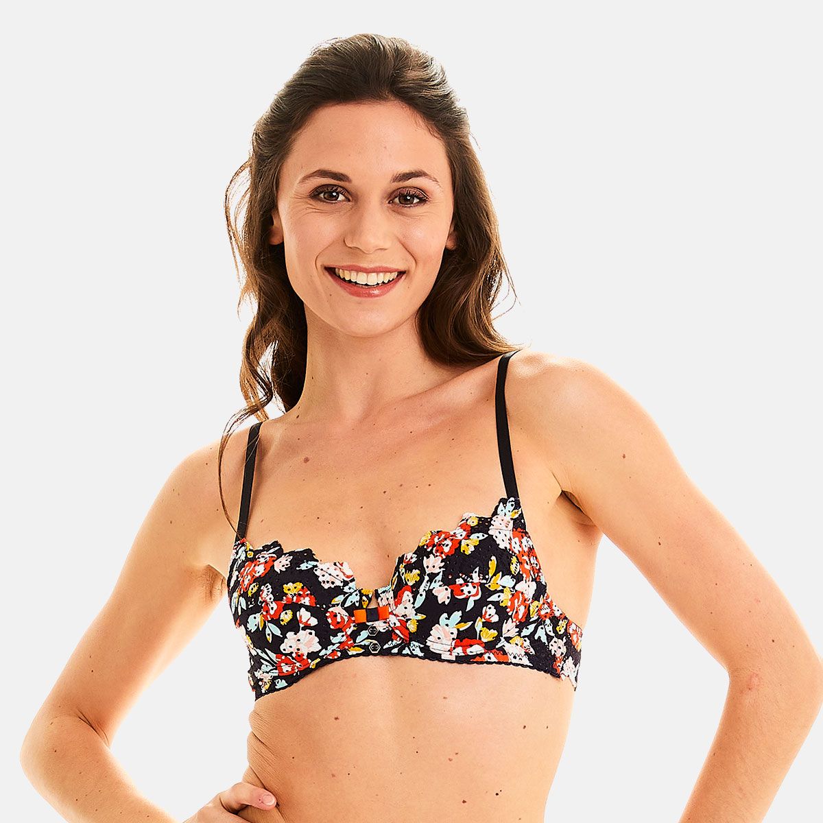 Le soutien-gorge ampliforme tout en dentelle mate, graphique et géométrique complète la ligne MAGMA. Conçue dans un esprit de broderie anglaise, la dentelle est imprimée d'un motif floral multicolore. Son décolleté classique mettra en valeur votre poitrine. Les bretelles sont fines et réglables. Pour un maintien parfait, la basque sous poitrine est élastiquée. Un noeud gros grain bicolore et boutons hexagonaux émaillés habillent l'entre-seins. Les baleines de confort sur les ailes permettent d'être à l'aise en toutes circonstances. Le soutien-gorge MAGMA se ferme avec 2 agrafes sur 3 positions. Il est disponible du 85A au 95D.