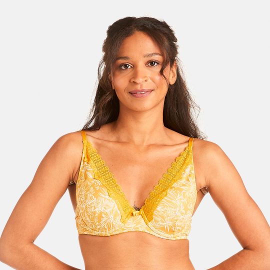 On craque pour le dessin fleuri qui habille la microfibre jaune du modèle PAMOISON. Le soutien-gorge ampliforme galbe la poitrine grâce à ses armatures et ses fines coques intégrées. Le décolleté classique est habillé d'un galon de dentelle pour une finition en forme foulard. Au dos, les bretelles sont fines et réglables. La basque sous poitrine est élastique. Un petit noeud satiné ton sur ton orne l'entre-seins. La fermeture se fait à l'arrière par 2 crochets sur 3 positions. Ce modèle est proposé du 85B au 95C.
